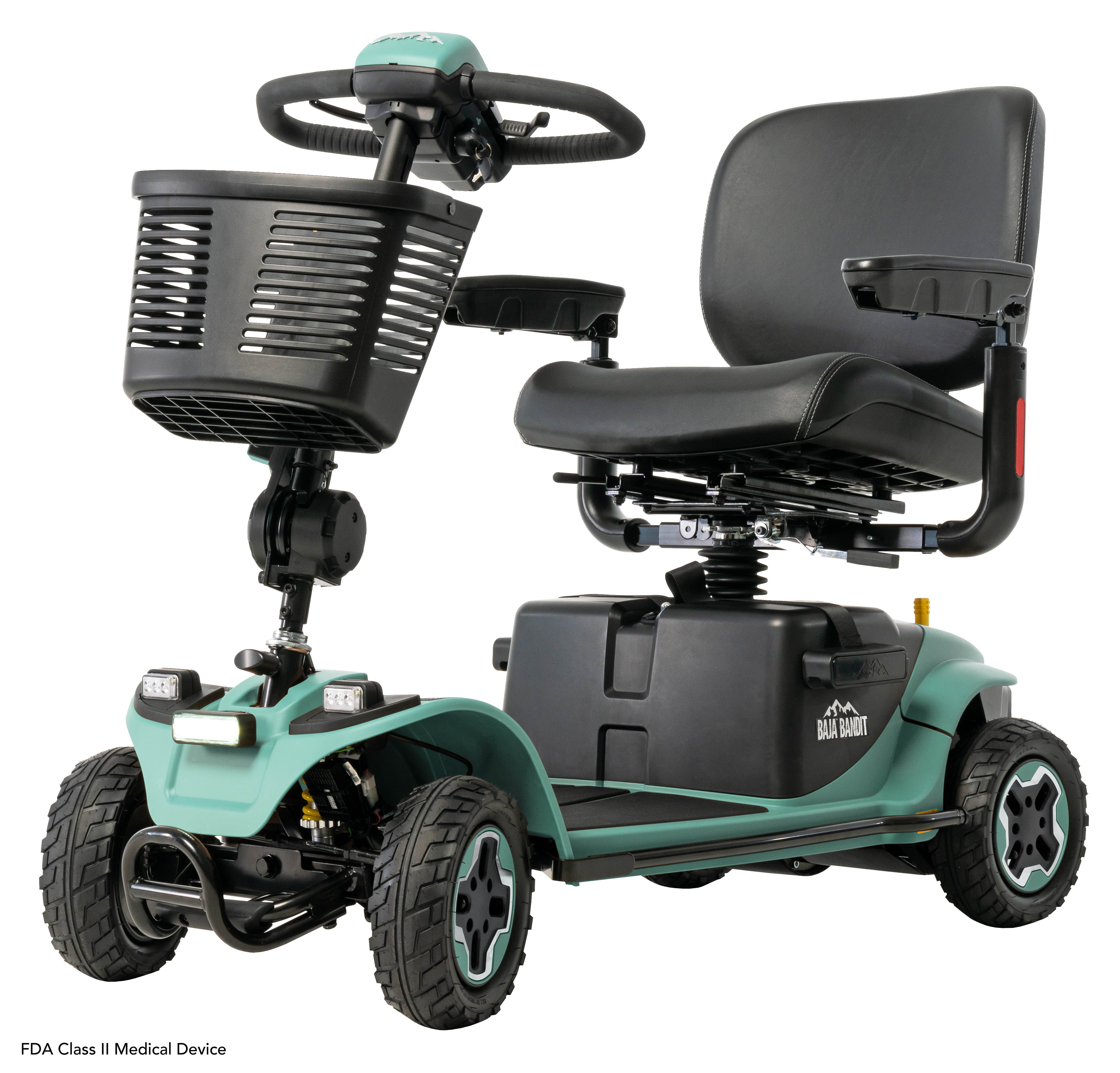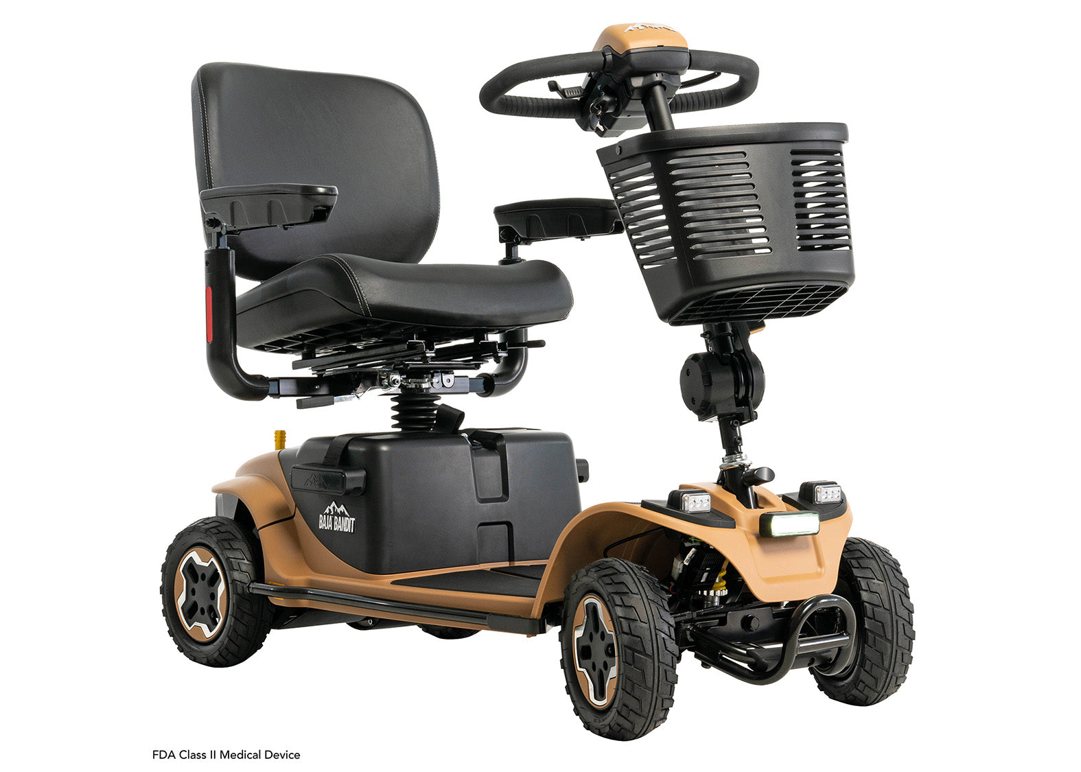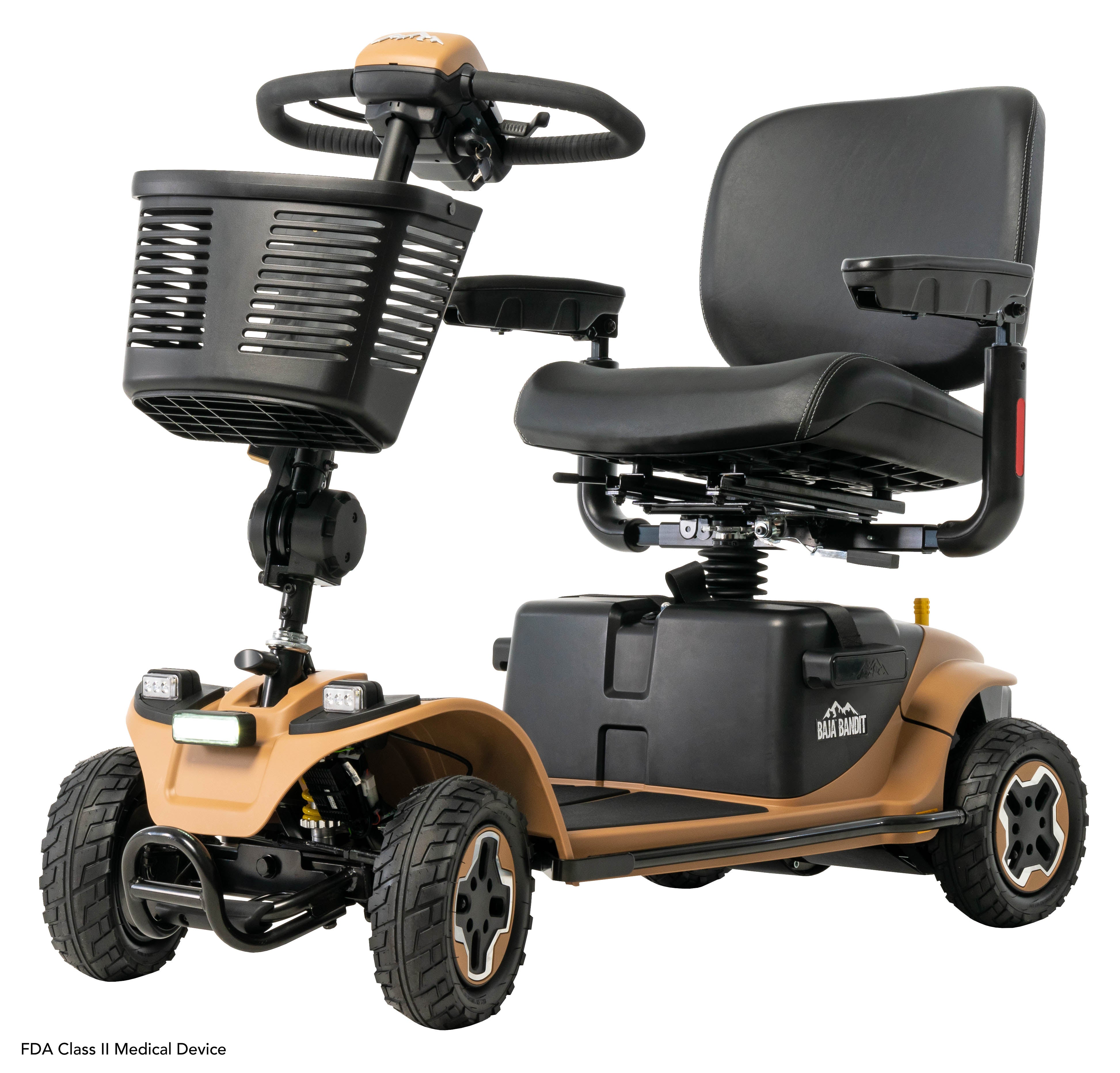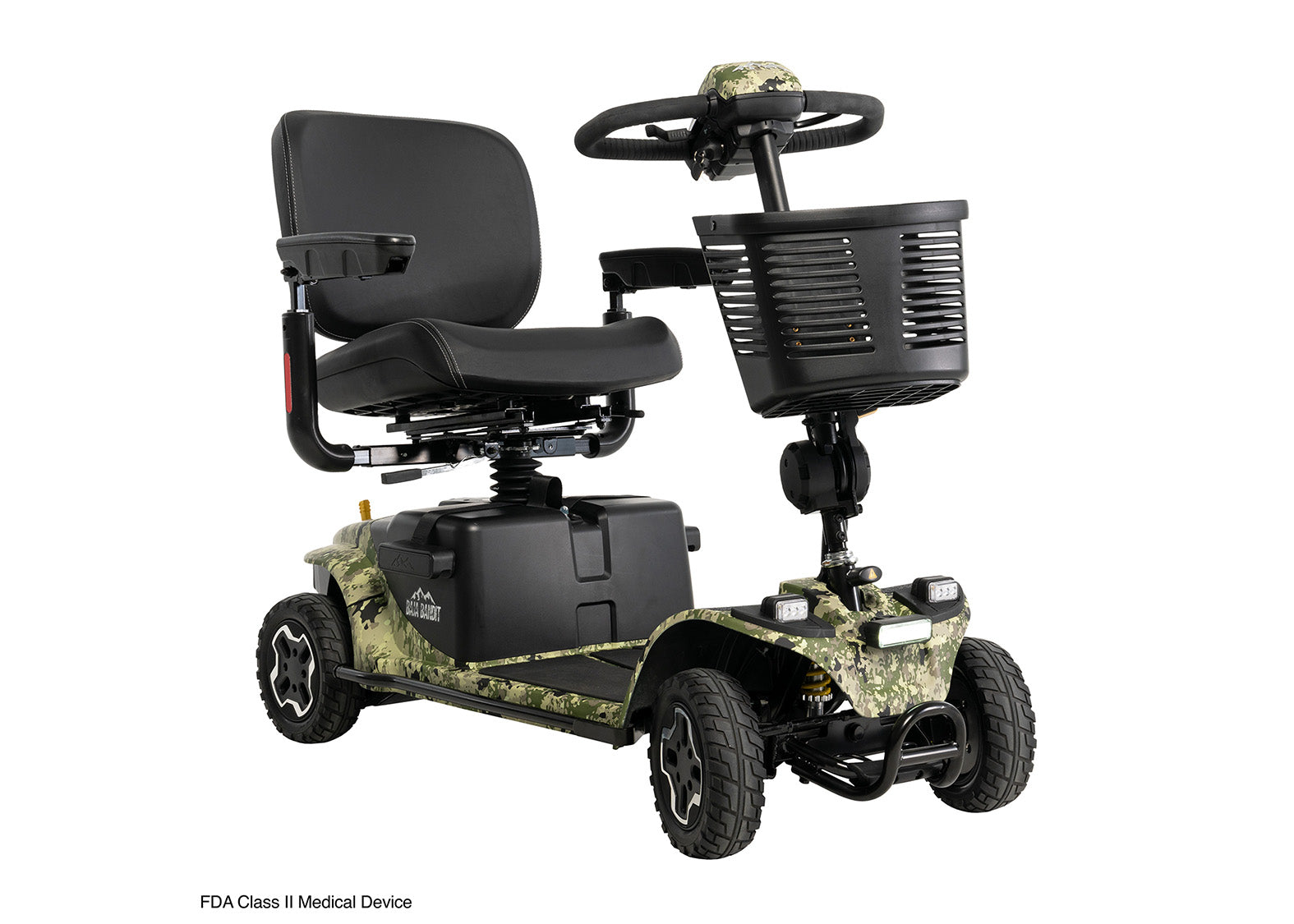 The Baja Bandit by Pride Mobility is a rugged and powerful 4-wheel scooter designed for outdoor use. With its large, all-terrain wheels, it can navigate various terrains, including gravel, grass, and uneven surfaces. Perfect for exploring the outdoors when it comes to camping or fishing. The Baja Bandit has a full suspension system, providing a smooth and comfortable ride. It has a maximum speed of 8 mph and an extended battery of up to 29 miles, allowing for extended outdoor adventures.